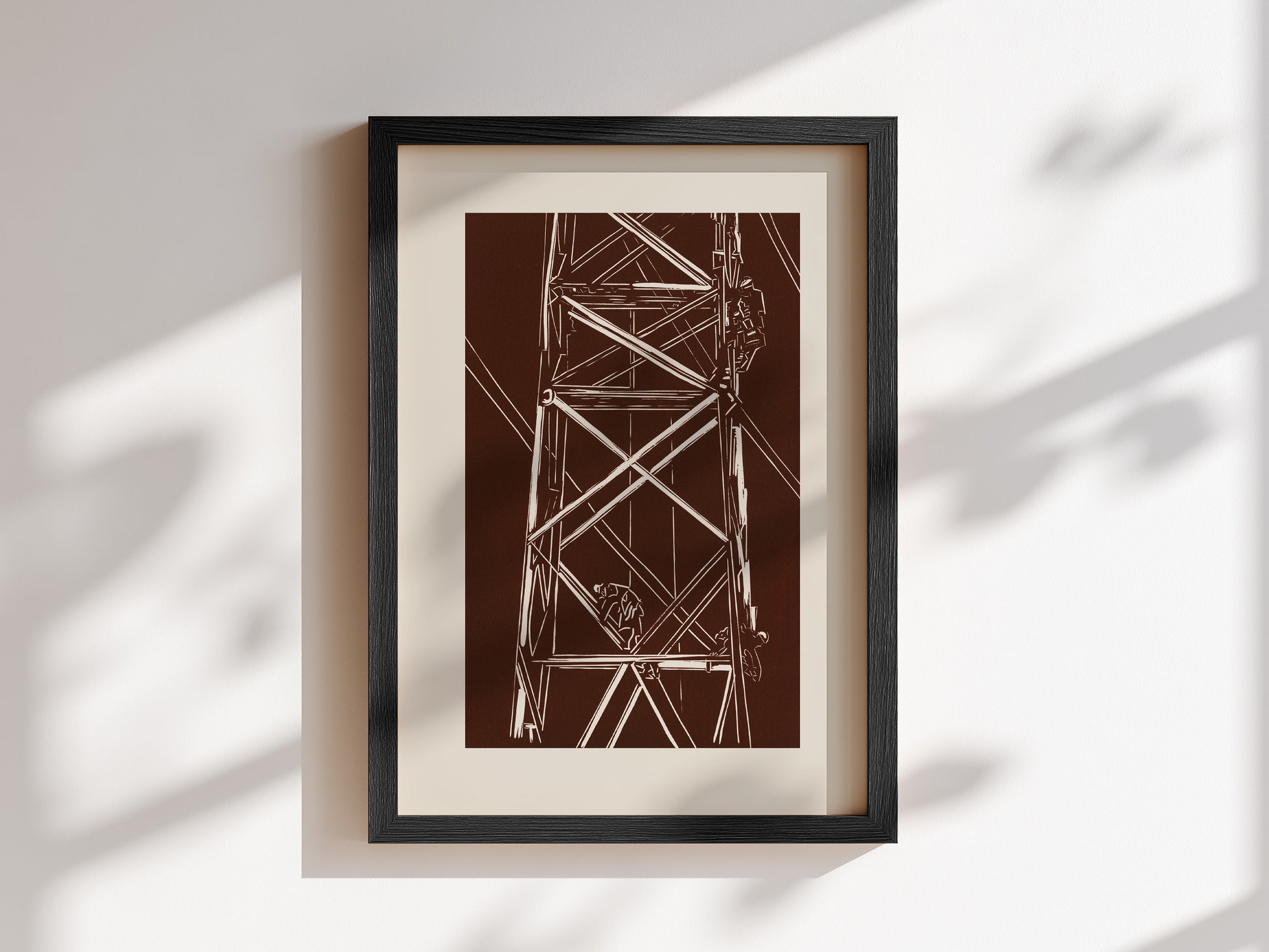 Part of the Working London series. This piece shines a spotlight on the essential work of maintaining the city’s power infrastructure. This artwork captures the skilled technicians who climb towering pylons to ensure that London’s electrical grid stays intact and functional.  Originally created as a lino cut and reproduced as a fine art print.